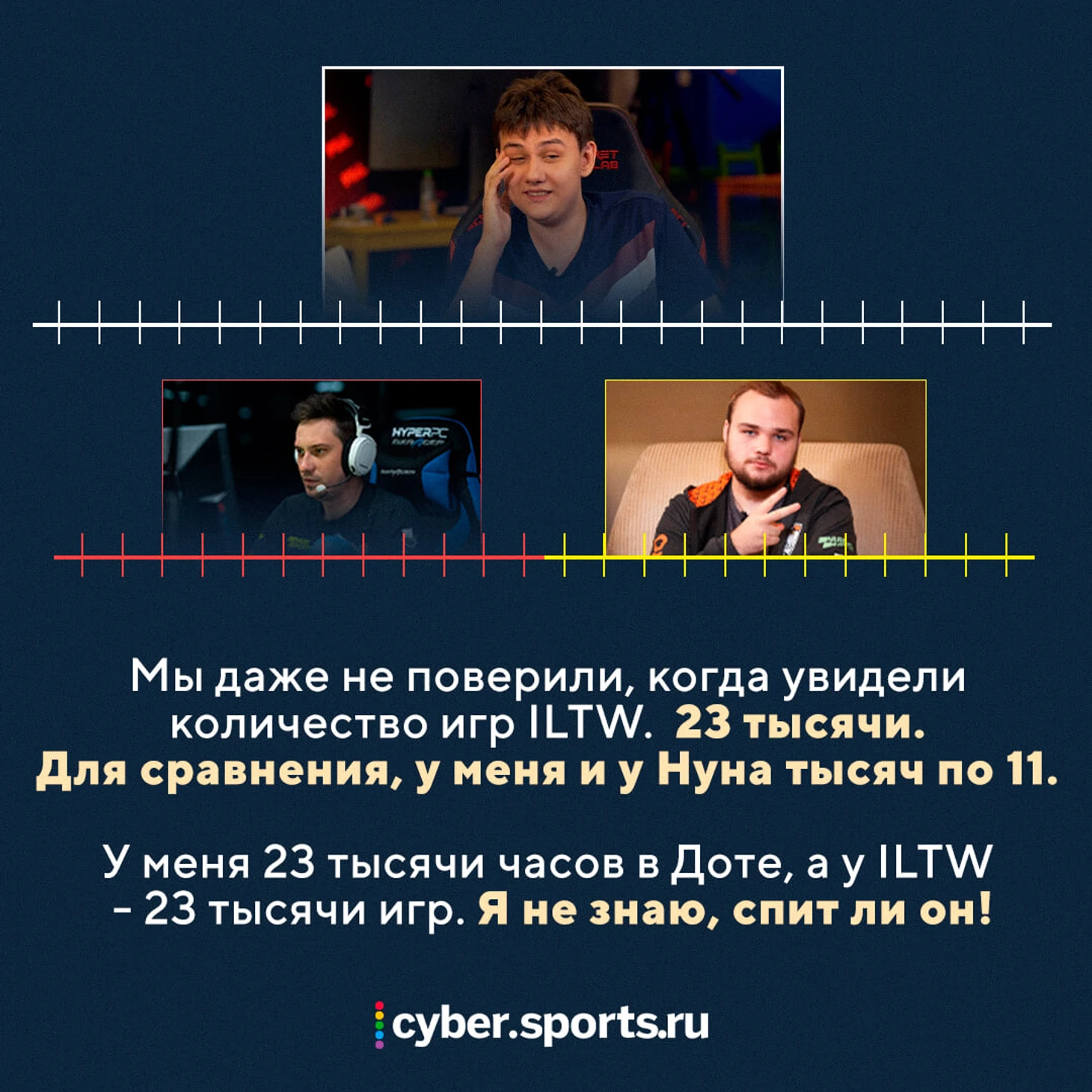 С Игорем я уже был знаком. Мы выиграли WESG, где он отлично себя проявил. Он выступает на про-сцене 3-4 года, ездил на ланы и все это время был на виду, никогда не переставал играть. А еще у него огромное количество сыгранных матчей. Если честно, мы даже не поверили, когда увидели. На дотабаффе не все игры отображаются, но и там у него 16 тысяч. Но когда загружается игра, иногда высвечивается статистика с процентами побед. И там в общем количестве игр у него 23 тысячи. Для сравнения, у меня и у Нуна тысяч по 11. Вот у меня 23 тысячи часов в Доте, а у ILTW – 23 тысячи игр. Я не знаю, спит ли он! Но факт остается фактом: он очень любит игру.