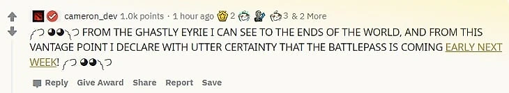 Наконец-то мы получили информацию о появлении Боевого Пропуска в Доте! И, как ни странно, появилась она не в официальном блоге Valve, а на Реддите от одного из разработчиков – по его словам, Battle Pass выйдет в начале следующей недели.