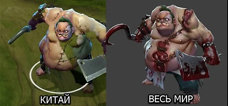 Китайская цензура – жесткая штука. Там запрещены изображения человеческих черепов, костей, внутренностей и реалистичной крови, и даже мультяшная Дота попадает под это правило. Например, вот так выглядит китайский Пудж: