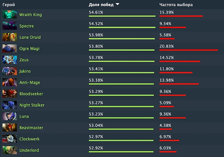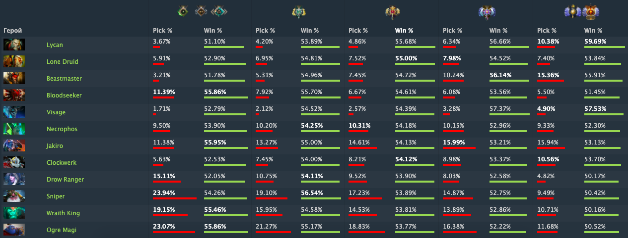 За это время были найдены уже все имбы: до 2к ммр тащит Джакиро, Огр, Бладсикер и Леорик, с 2 до 3 – Снайпер, Луна и БС, с 3 до 4 – Бистмастер, Ликан и Друид, а выше – Визаж, Ликан, Бистмастер и Бруда. Просцена тоже определилась с фаворитом: уже 5 турниров подряд Secret громит всех соперников.