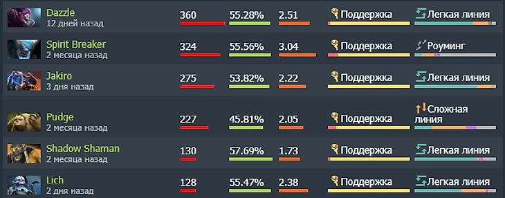 Топ 6 героев с с моего Дотабаффа. Винрейт не заоблачный, но все же выше 50%.