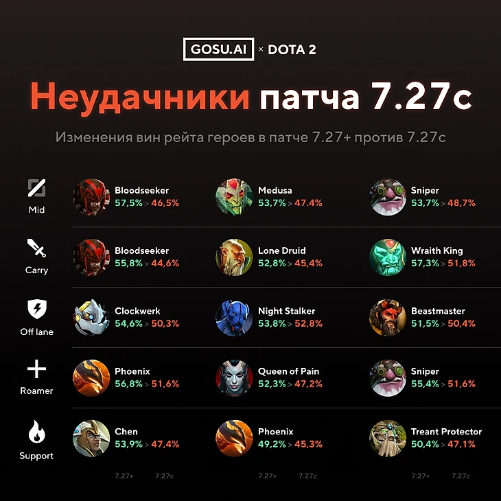 Неудачники патча 7.27c Изменения винрейта героев в патче 7.27+ против 7.27c