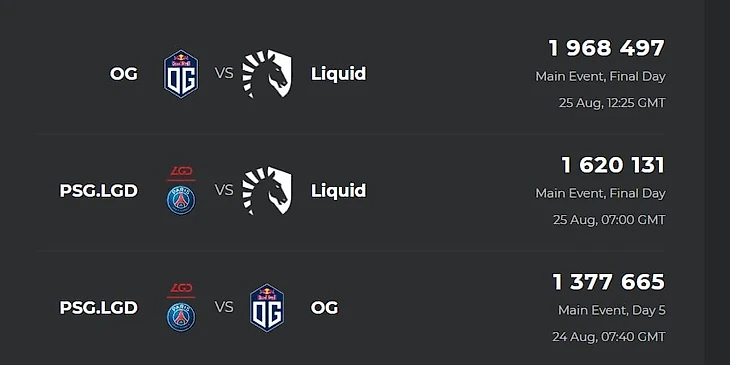 Телеканал «Матч! Игра» показывал турниры по CS:GO и Dota 2 еще в 2016 году, но все-таки киберспорт обычно смотрят в интернете или клиенте игры. Общая аудитория киберспорта в 2018 году оценивалась в 380 миллионов человек, финал чемпионата мира по Доте в 2019 году на пике смотрели 1,968 млн зрителей — абсолютный рекорд для TI. Кстати, именно The International 2019 имел самый высокий призовой фонд в истории. Участники разыгрывали более 31 миллиона долларов. Скорее всего этот рекорд будет побит совсем скоро – призовой фонд TI 10 уже составляет более 30 миллионов долларов.