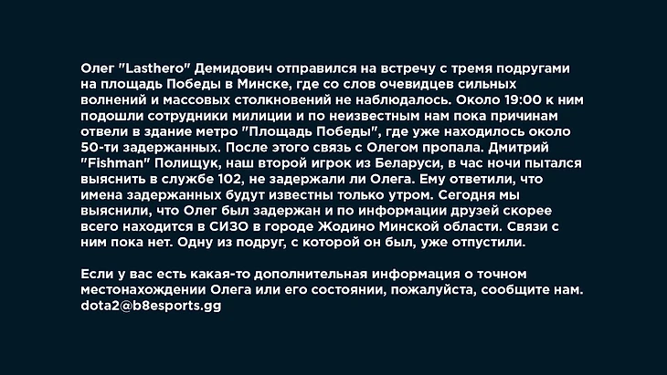 «Если у вас есть какая-то дополнительная информация о точном местонахождении Олега или его состоянии, пожалуйста, сообщите нам», – говорится в сообщении. Также B8 оставили адрес электронной почты, по которому можно с ними связаться и сообщить информацию – dota2@b8esports.gg.