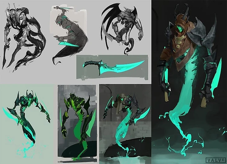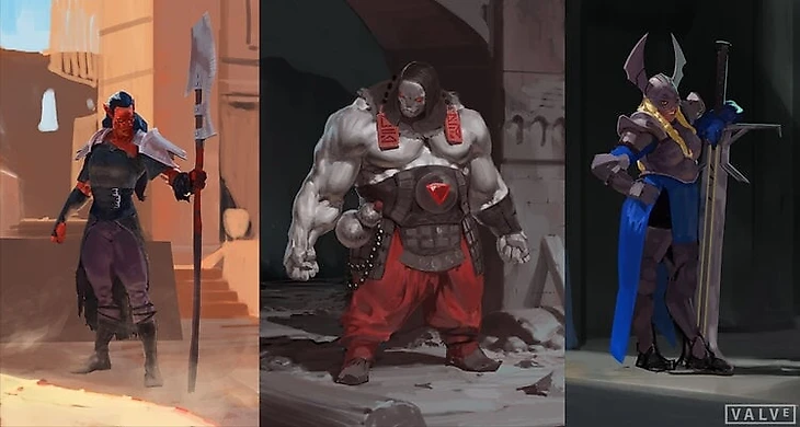 • Мы видели концепт этого героя раньше. Работы Drew Wolf, художника, работавшего в Valve над RPG, которую позже закрыли, а наработки, в том числе и героев, раскидали по другим проектам. Интересующий нас арт – крайний справа.
