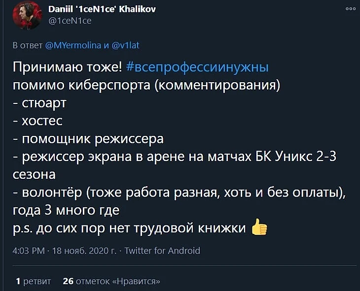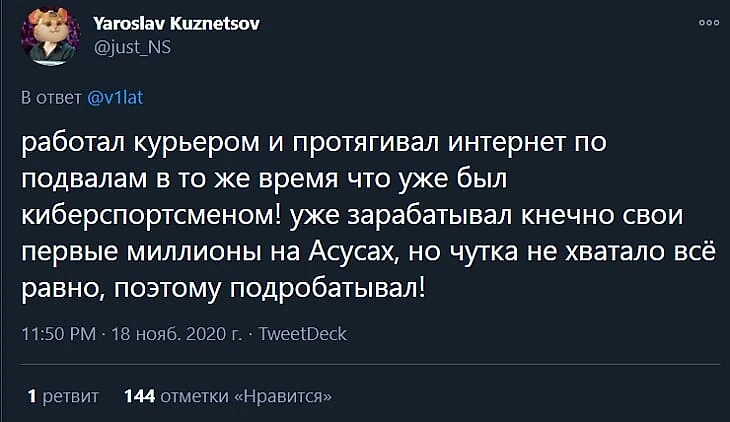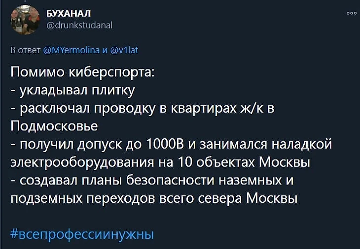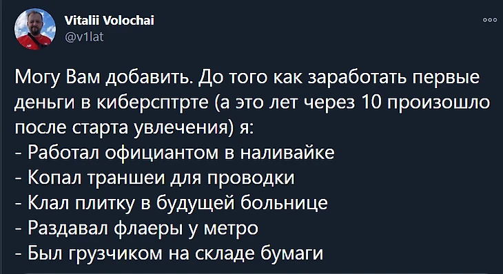 После чего Виталий написал еще один твит, где перечислил, где работал до того, как стал зарабатывать Дотой: