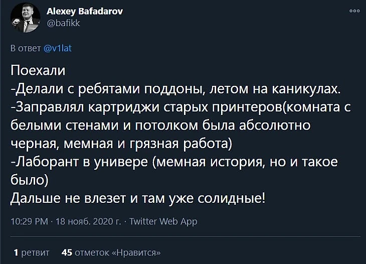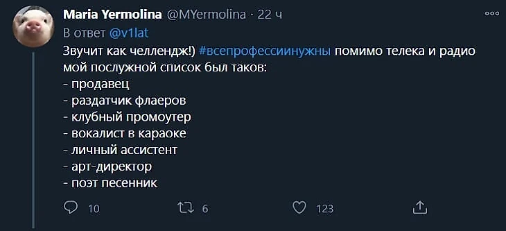В реплаи к нему пришла Мария Ермолина и запустила флэшмоб: у нее большой бэкграунд!