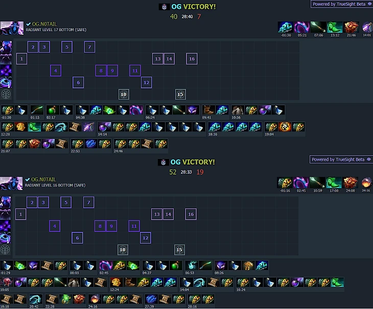 После лейнинга Нотейл не остается фармить в легкой линии, как Пуппей, а идет пушить тир-1 соперника – один или с командой. На первой карте он вообще пришел к башне в легкой оппонента на 8-й минуте, имея лишь четвертый уровень, и сломал ее к концу 9-й. Во второй игре Энигма присоединилась к команде при пуше башне в миде на 10-й минуте. Нотейл один раз умер, но затем вернулся мид и закончил начатое.