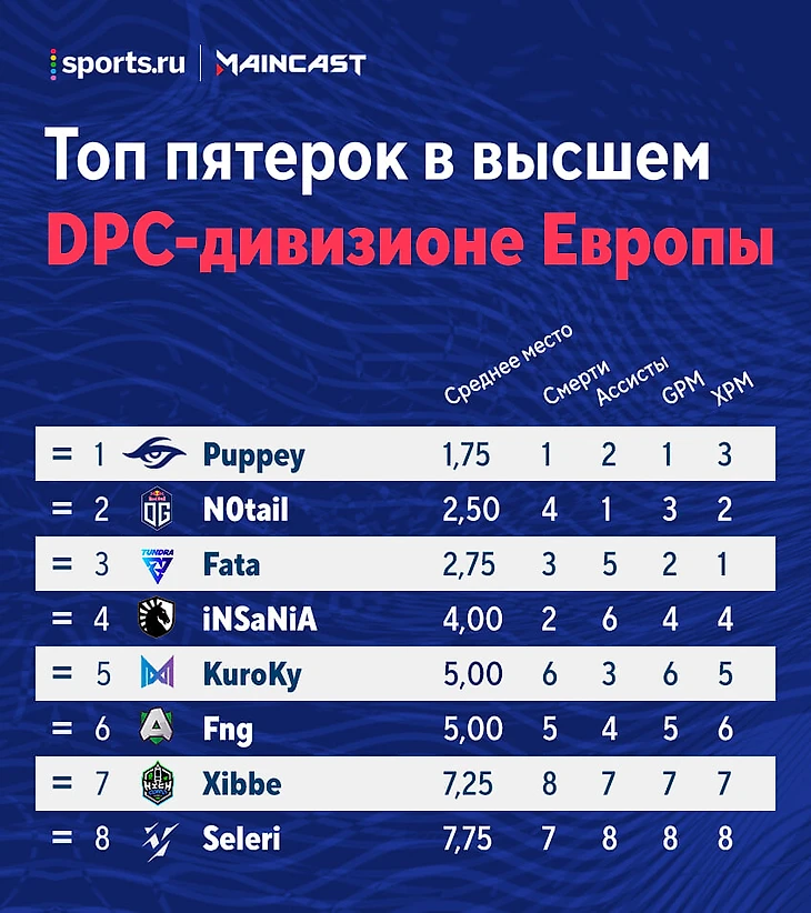 ► В таблице пятерок никаких изменений не произошло, но можно отметить сокращение разрыва между Пуппеем и Нотейлом. Капитан Secret здорово сыграл против Alliance: ни разу не погиб на Чене на первой карте, а также умер в 2 раза меньше стандарта на второй карте на Фурионе и на третьей на Котле. Но лидер OG, отыгравший на Энигме 10-0-17 на второй карте и 3-6-16 на третьей против Nigma, превзошел абсолютно всех. А еще Нотейл сыграл 2-0-11 на Котле на второй карте против Vikin.gg.