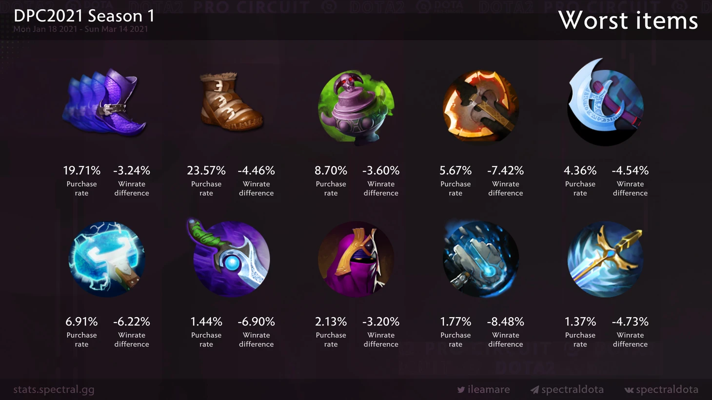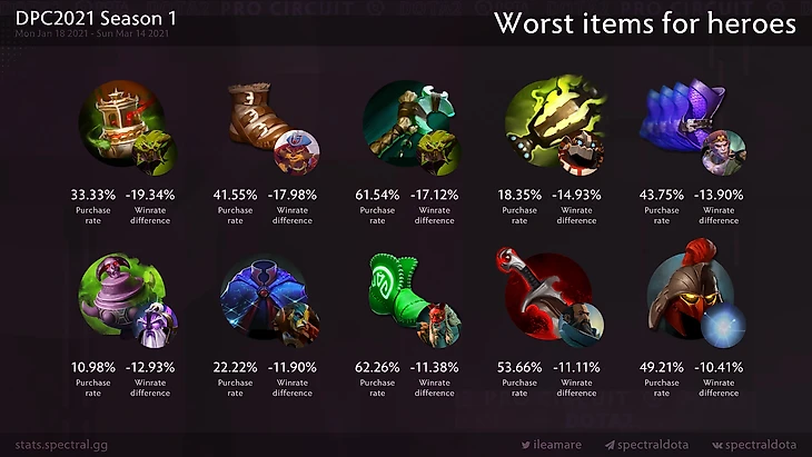 Среди худших предметов, помимо стандартных уже ранних предметов, зависящих от таймингов, особняком стоит Battle Fury. Помимо столь сильного понижения процента побед (-7.42%) в рамках соревновательного сезона, градиент винрейта у данного предмета на прошлой неделе в рейтинговых матчах ранга Immortal составил -9.89%. Это значит, что предмет с каждой минутой задержки от тайминга "теряет" почти 10% из потенциального шанса на победу.