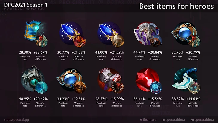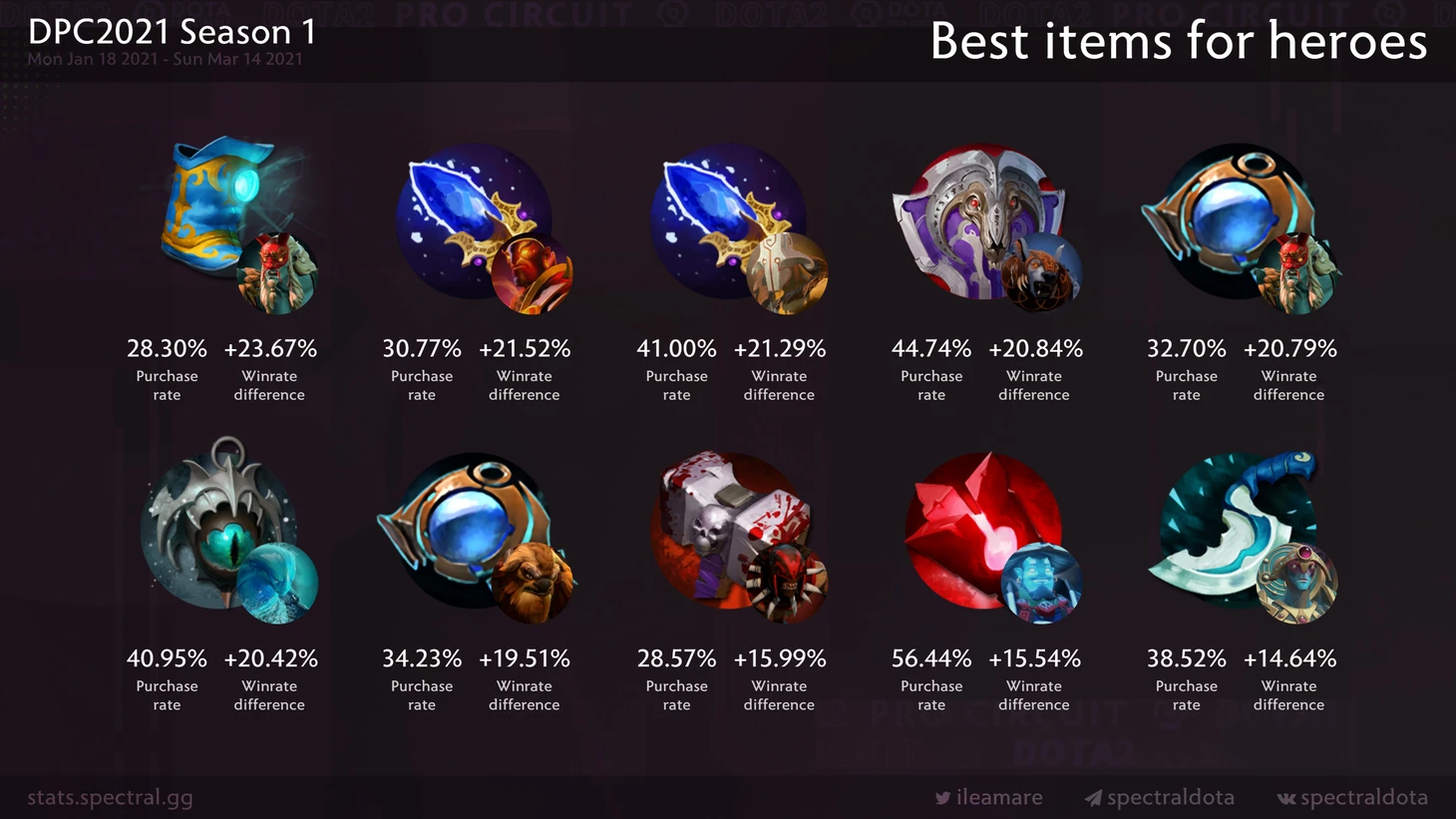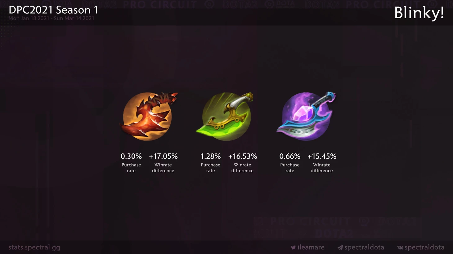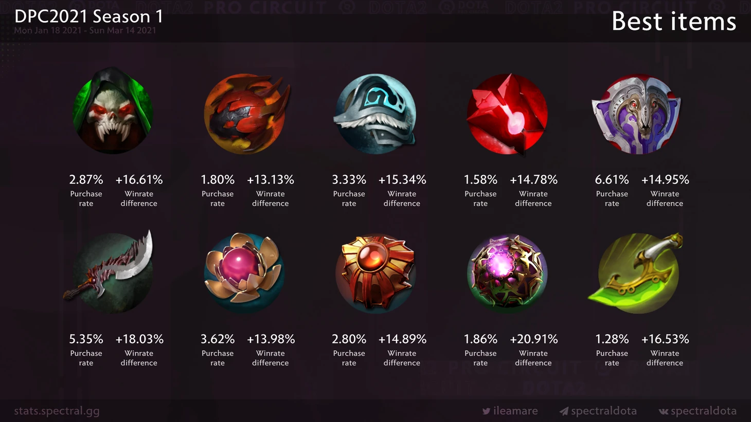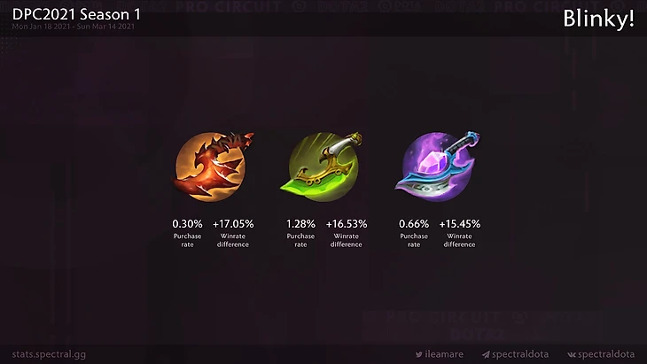 Среди наиболее любопытных сразу можно выделить Octarine Core, ставший самым сильным предметом по приросту винрейта, Swift Blink, ставший одновременно самым популярным улучшением Blink Dagger, и Vladmir's Offering, являющийся самым дешёвым предметом с настолько высоким приростом.