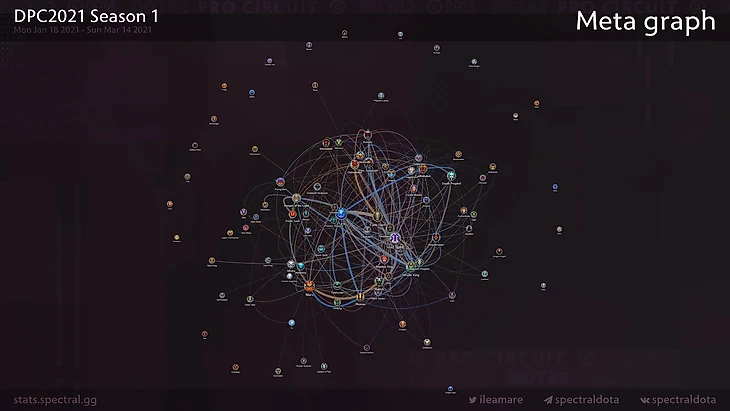 Из-за достаточно разнообразной меты граф связок героев в целом выглядит достаточно спутанным, но даже в таком виде определённо выделяются Puck, Mars, Phoenix, Void Spirit, Keeper of the Light и Wraith King.