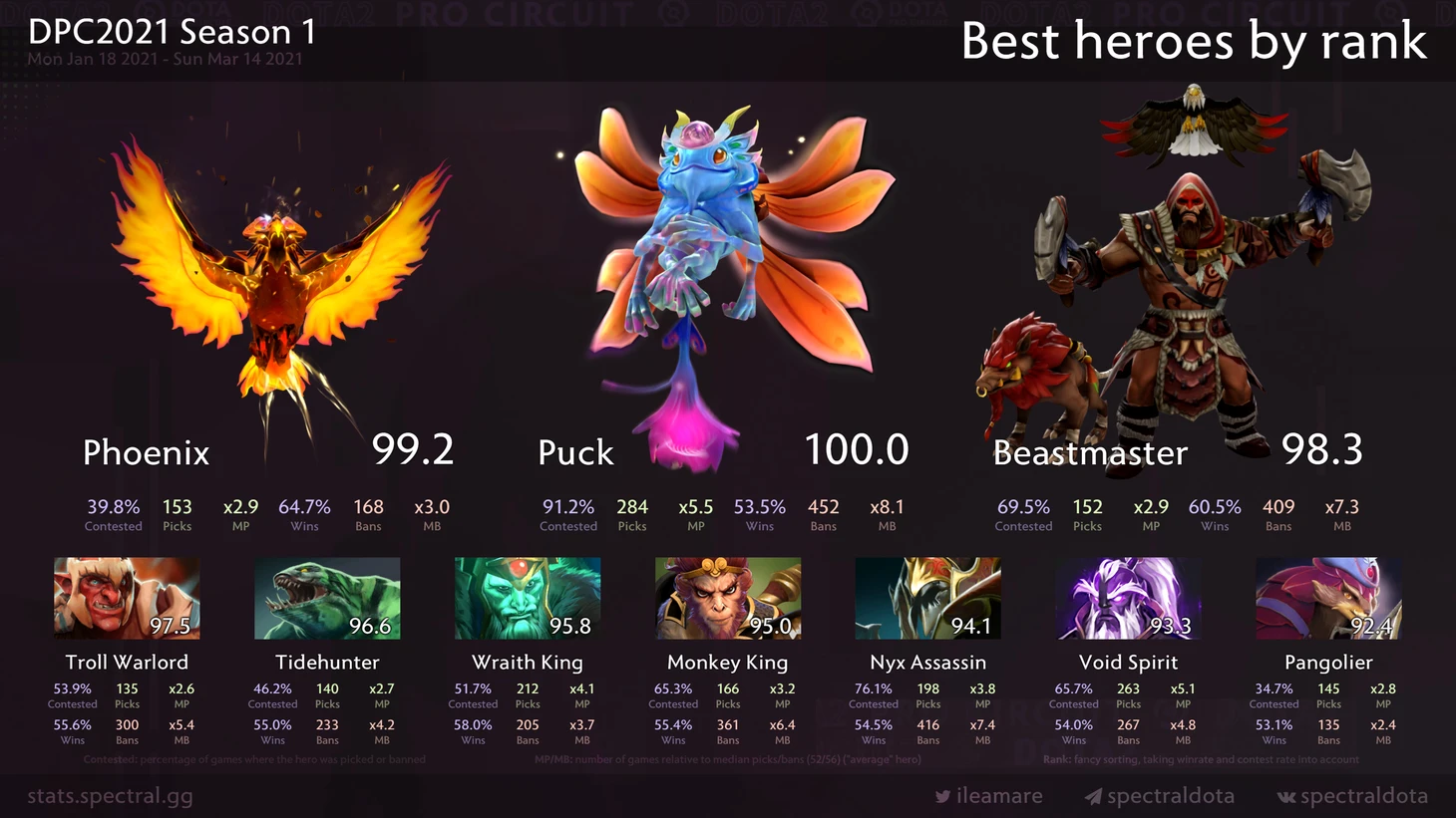 Ну и начать стоит с обзора лучших героев по рангу — то есть героев с самыми высокими винрейтами при учёте их частоты пиков и банов. Больше всего успел выделиться Puck: этот герой находился в топе по количеству пиков и банов в каждом из регионов, а также успел стать одним из самых востребованных героев и в рейтинговых играх на 6k+ MMR. Востребованы при этом были все герои, но лишь Necrophos не был выбран ни разу.