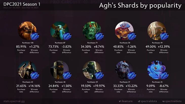 Ну а во-вторых — статистика самых популярных Aghanim's Shard'ов. В особенности выделяются, конечно, Earthshaker, шард для которого стал уже де-факто необходимым, и Nature's Prophet: частота покупки шардов, а также количество покупок, такие, что предмет по сути покупается практически в каждой игре. По успешности же сразу бросаются в глаза Earth Spirit и Nyx Assassin.