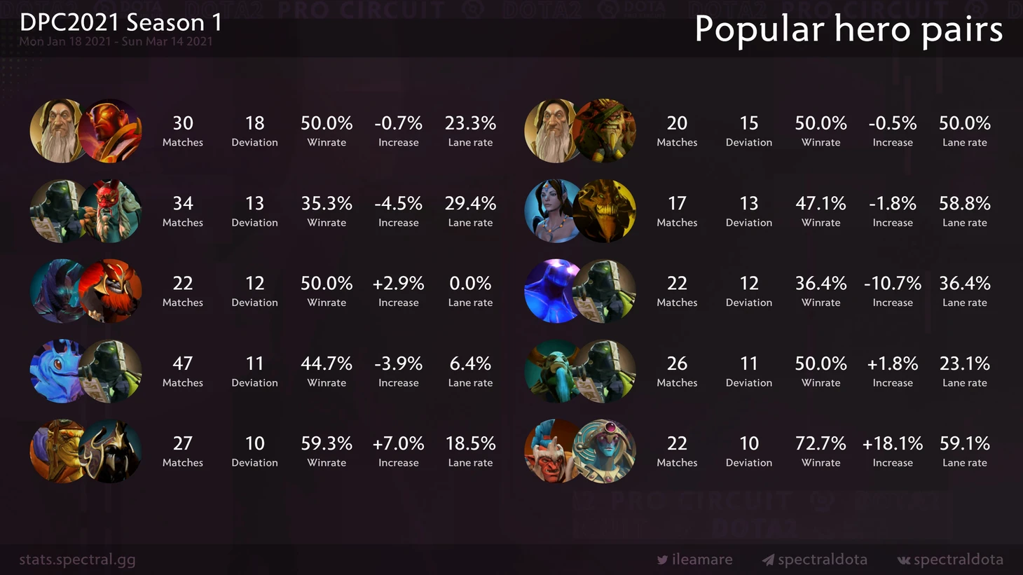 Стоит обратить внимание на пары героев. Очень популярными были разные комбинации с Keeper of the Light и Earth Spirit, однако самой сильной среди наиболее популярных пар можно выделить Troll Warlord + Oracle: эта связка имеет 72.7% побед (на 18% больше, чем ожидаемый процент побед пары).