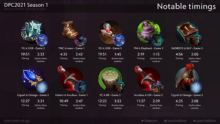 Предметы для рекордов по самым ранним таймингам были отобраны на основе градиентов винрейта в рамках пары герой-предмет. Говоря проще — все перечисленные предметы ОЧЕНЬ чувствительны к времени покупки, а все перечисленные рекорды являются самыми ранними покупками этих предметов (а рядом указано, насколько этот тайминг ниже стандартного).