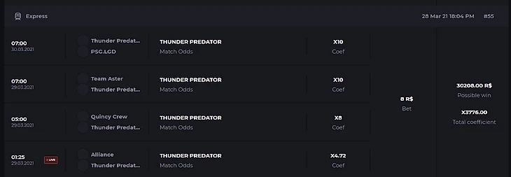 Филипе «Astini» Астини, бывший бразильский тренер B8, опубликовал в своем Twitter ставку-экспресс, общий коэффициент которой составил 3776. 3 из 4 матчей (Alliance vs Thunder Predator, Team Aster vs Thunder Predator и Quincy Crew vs Thunder Predator) перуанский коллектив уже выиграл, если же он обыграет PSG.LGD сегодня, то Astini заработает ~$2000, поставив при этом ~$0,6.