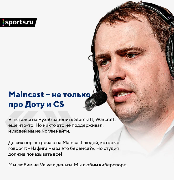 «В RuHub мы сделали много, но мы не сделали глобальный хаб по играм. У нас была Dota 2 и CS:GO. Я всячески пытался на Рухаб зацепить Starcraft, Warcraft, еще что-то. Но никто это не поддерживал, и людей мы не могли найти. В итоге не было киберспортивной студии, была студия освещения игр Valve – и все. И я до сих пор встречаю на Maincast людей, которые говорят: «Нафига мы за это беремся?» Но студия должна показывать все! На RuHub этого сделать не получилось, потому что это не приносило краткосрочной прибыли. А мы любим не Valve и деньги, которые приносят Dota 2 и CS:GO. Мы любим киберспорт. А теперь смотрим дальше», – объясняет Виталий.