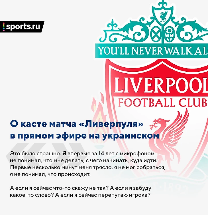 «Отказываться от этого было глупо, – делится он и даже меняется в голосе. – При том, что я никогда в жизни не работал на украинском языке. Это был мой первый в жизни эфир на украинском языке! Работы было много, поэтому толком подготовиться у меня не получилось. Начал только за день до матча. Да, я смотрю «Ливерпуль», составы я знаю, игроков я знаю. Но я был много к чему не готов!»