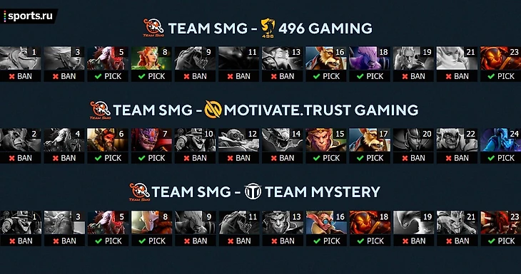 И просто для сравнения – драфты SMG в этом сезоне DPC-лиги. Да, не полное копирование, но общие связки и яркое пересечение концепций драфтов точно есть – любовь к пятерке-Брю и мид-Рики, агрессивная дабла в легкой через Грима и упор исключительно на 4+1: