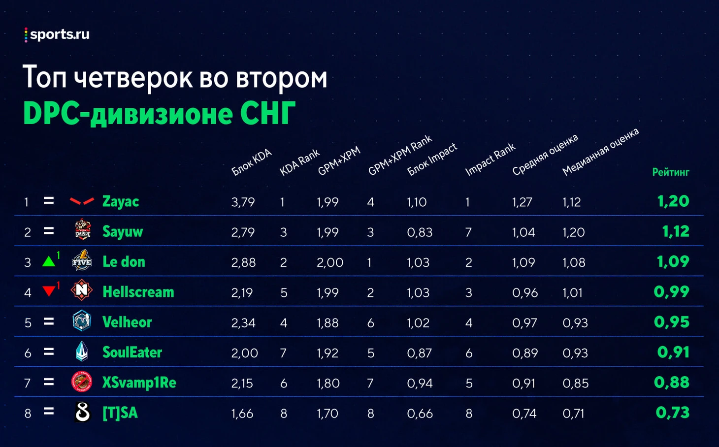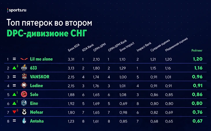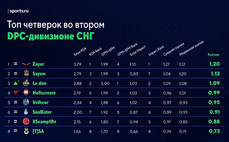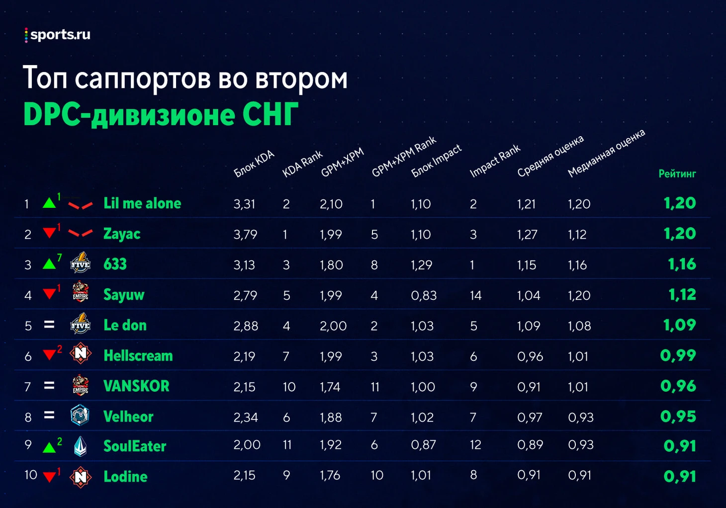 – А вот Le don вырвался в топ еще до своих партнеров. Неделю назад он уже котировался под номером 5 в таблице саппортов и под номером 4 среди четверок. Но теперь все еще лучше: +0,11 по рейтингу, +1 строчка в профильном списке и солидный отрыв от 6-го места среди саппортов.