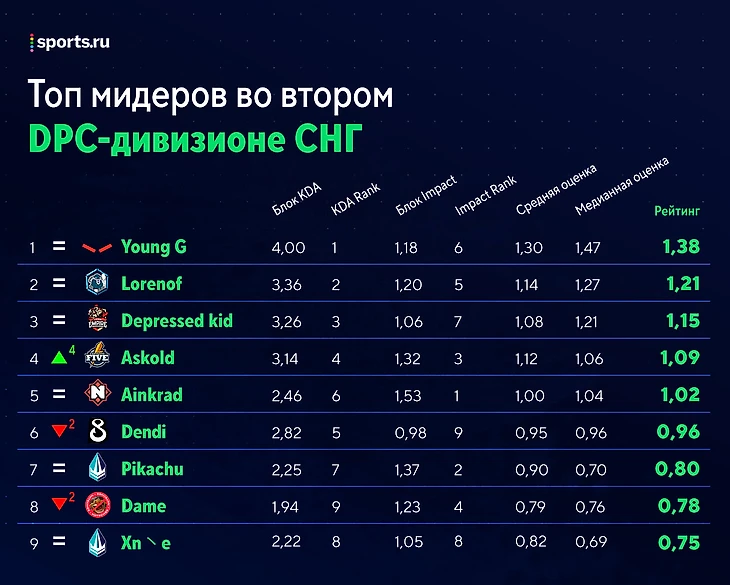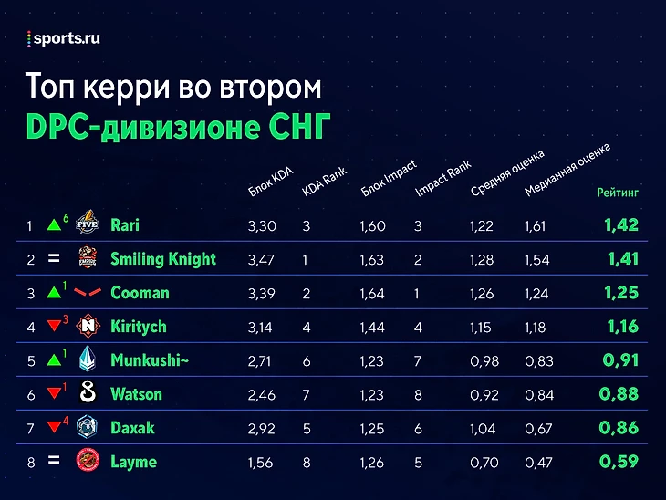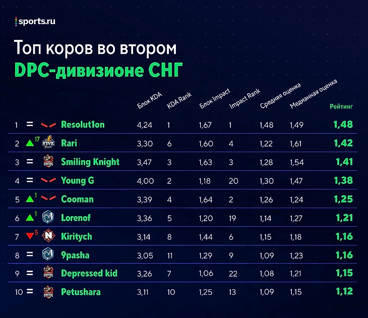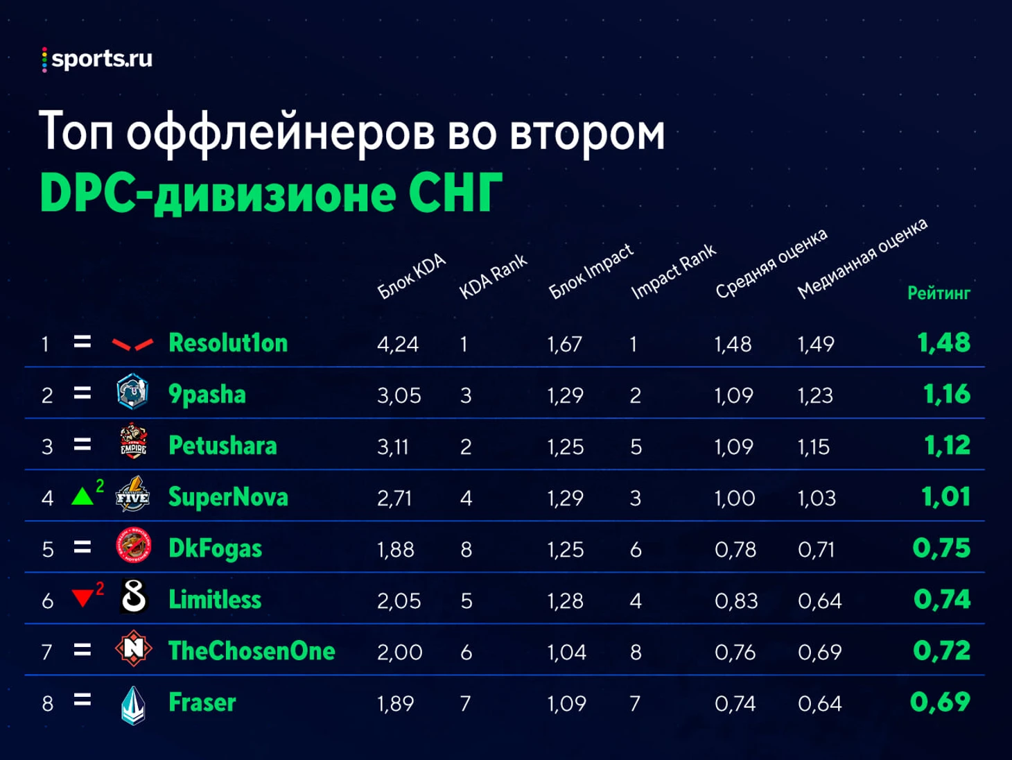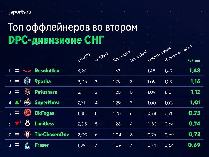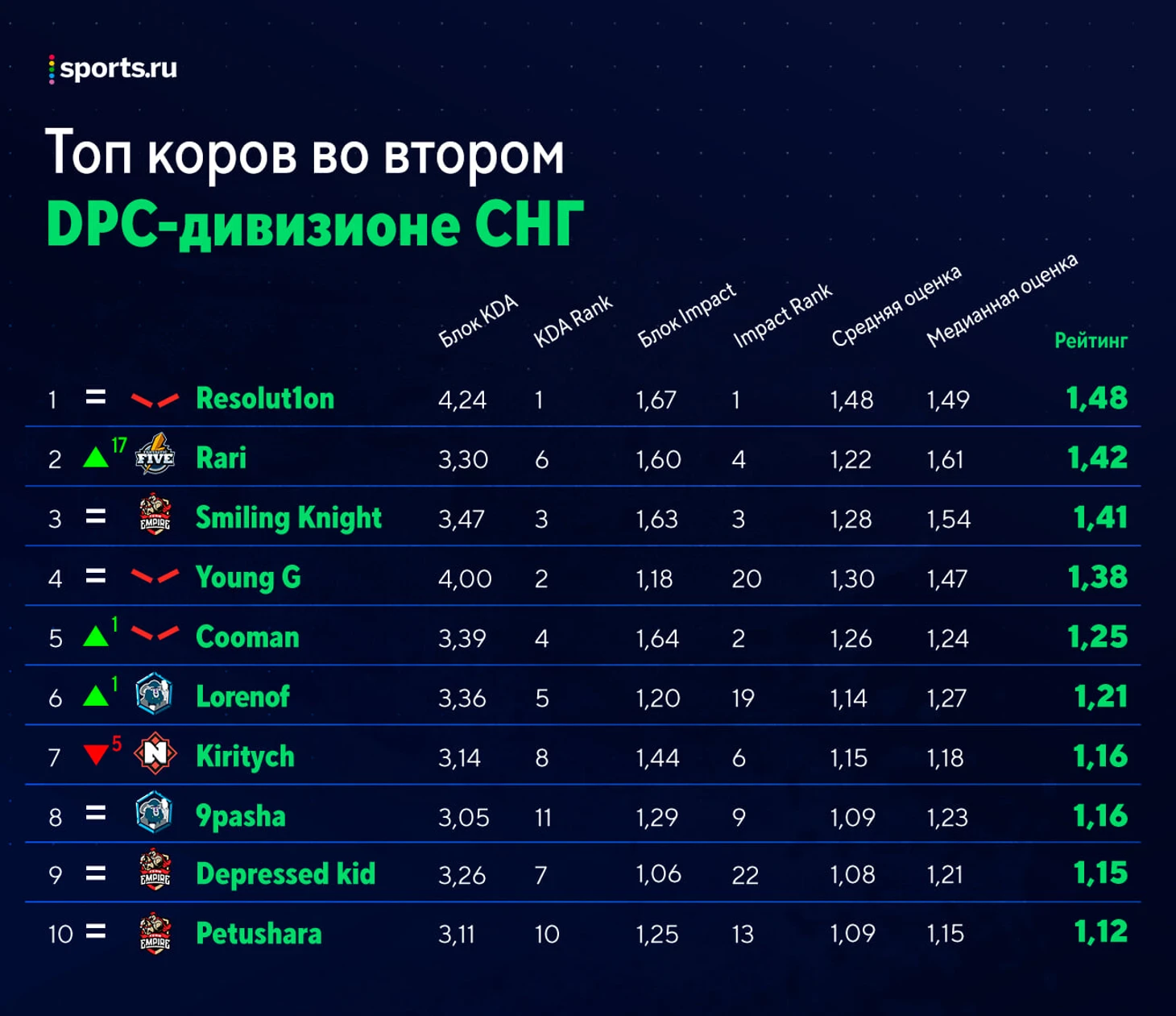 – А вот Le don вырвался в топ еще до своих партнеров. Неделю назад он уже котировался под номером 5 в таблице саппортов и под номером 4 среди четверок. Но теперь все еще лучше: +0,11 по рейтингу, +1 строчка в профильном списке и солидный отрыв от 6-го места среди саппортов.
