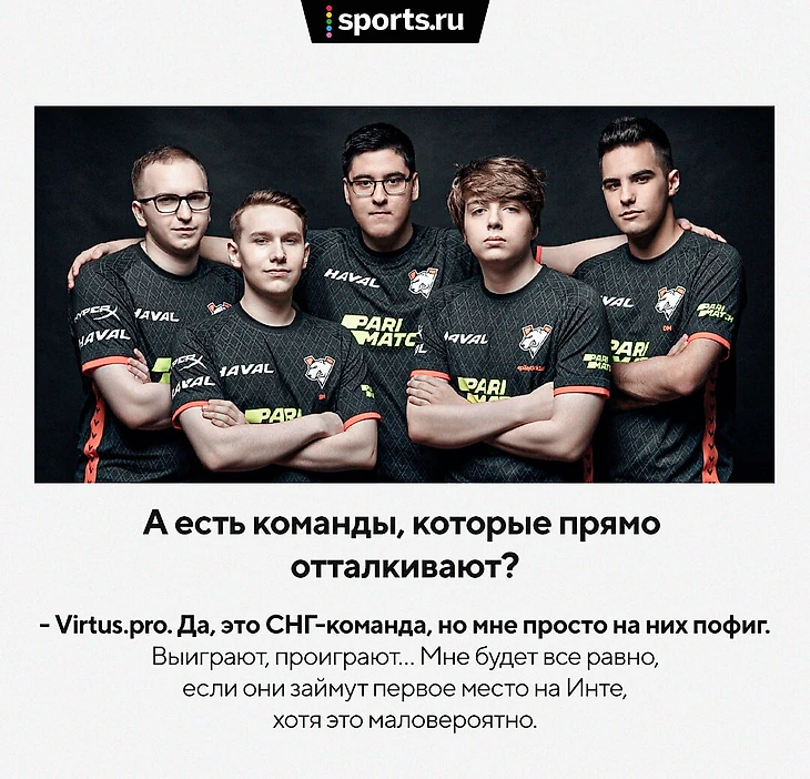 – Virtus.pro. Да, это СНГ-команда, но мне просто на них пофиг. Выиграют, проиграют… Если сравнивать с предыдущим составом VP, где были очень харизматичные игроки… Не, безусловно, они – одни из сильнейших игроков в мире, но следить за ними не хочется. Мне будет все равно, если они займут первое место на Инте, хотя это маловероятно.