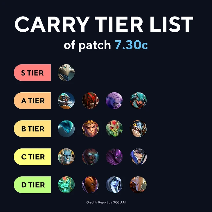 Привет! Сегодня Мы хотим вам показать наш Тир лист керри героев патча 7.30c. Персонажи из этого списка выбраны на основе опыта 7-8к ммр игроков, топ ранкед пабликов и соревновательным матчей. Sven по-прежнему остается королем текущей меты. Так что если вы игрок на керри роли и хотите поднять свой рейтинг, то сейчас самое время начать активно спамить такие героев как Sven, Bloodseeker и Gyrocopter.