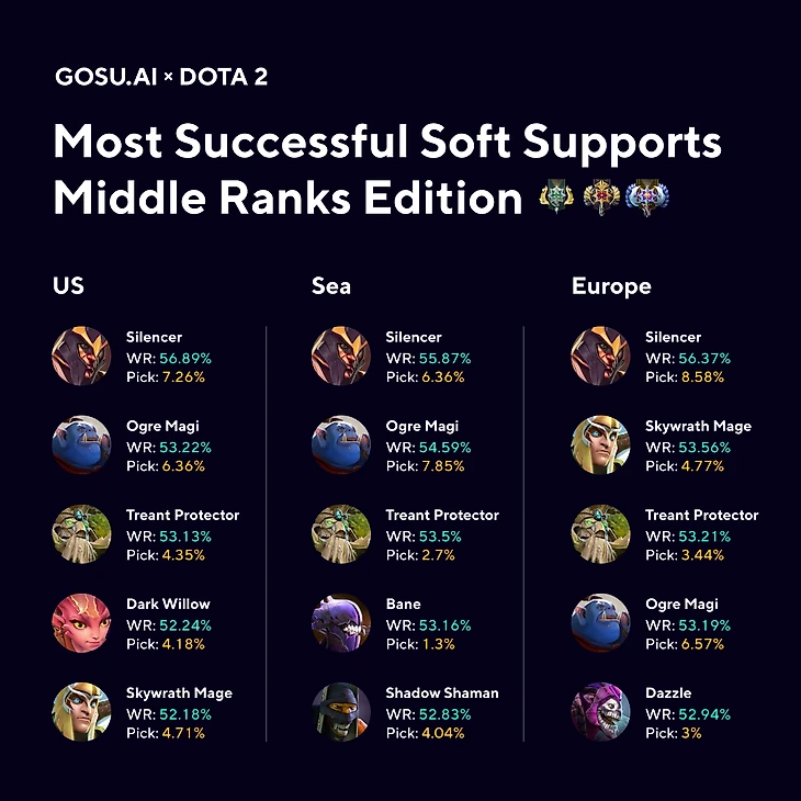 Привет! Сегодня мы хотим вам показать Софт саппортов с наибольшим вин рейтом на средних рангах. Как вы можете видеть, во всех регионах Silencer занимает лидирующую строчку. Изменения последних патчей, сделали этого персонажа эффективным как на стадии лайнинга, так и на более поздних этапах игры.
