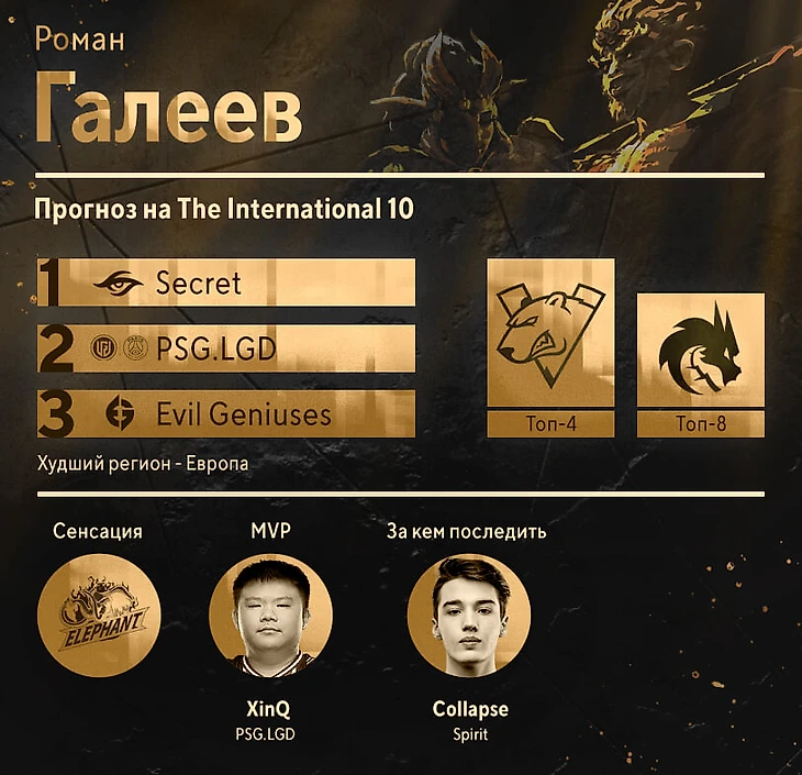 Стандартный и ожидаемый топ-2. Из андердогов больше всего верю в Т1, могут запрыгнуть в топ3 на фоне проблем IG и OG. Игроку уровня Arteezy уже достаточно мемов, проклятий и прочей ерунды. Пора брать MVP на самом большом турнире в истории киберспорта.