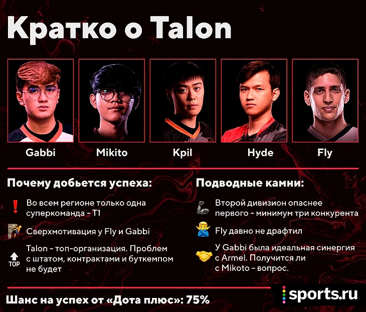 Состав по Лиге Легенд, например, занял 9-11-е место на Worlds, а до этого сыграл региональную лигу со статистикой 18-0. В общем, это крупная организация, которая может себе позволить сильный состав по Доте. Базироваться дота-состав Talon будет, кстати, не в Гонконге, а в Филиппинах.