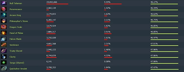 Важно: в выборке Дотабаффа есть много предметов хуже Мидаса, но все они (кроме Mask of Madness) являются частями более сильных артефактов. Понятно, что у Helm of Dominator низкий винрейт, потому что игроки не успели улучшить его до Helm of Overlord.