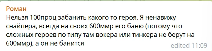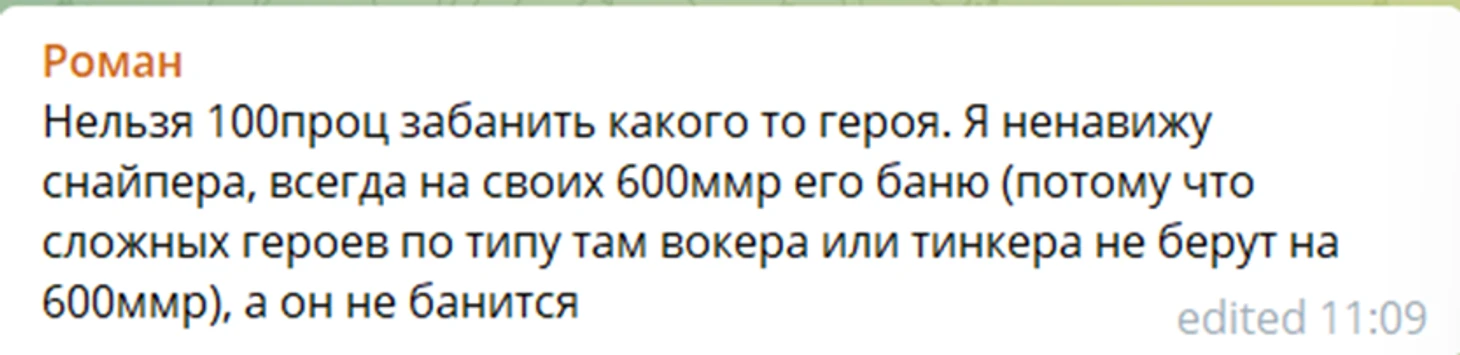 В теории большое количество банов помогло бы игрокам избавиться от конкретного героя, который не нравится по тем или иным причинам. Например, один из наших читателей рассказал, что на 600 ммр он не хочет играть против Снайпера, а Тинкеров и других сложных героев и так не берут.