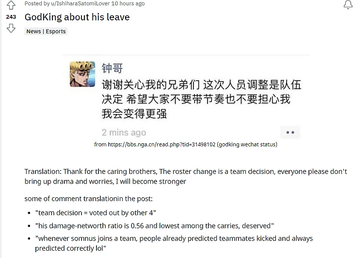 Перевод заявления Год-Кинга: Спасибо за заботу, братья. Изменение состава – это решение команды. Пожалуйста, не разводите драму и беспокойство, я стану сильнее.