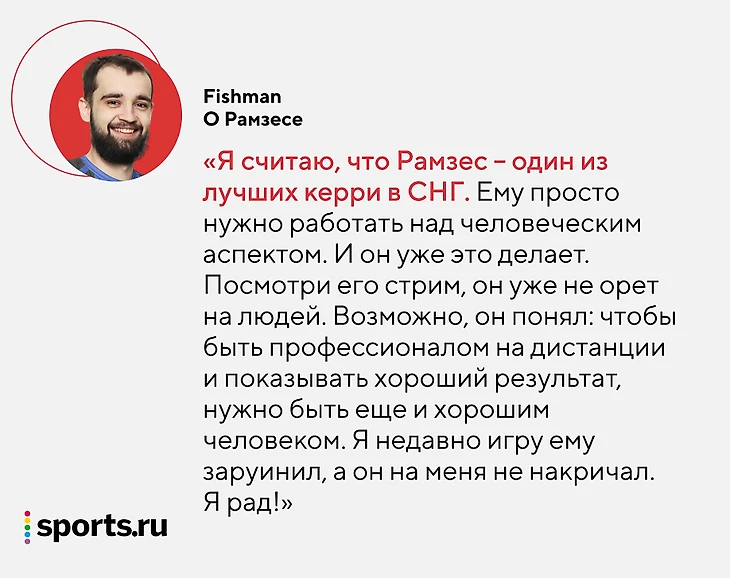 Но при этом я считаю, что Рамзес – один из лучших керри в СНГ. Он талантливый. Ему просто нужно работать над человеческим аспектом. И он, видимо, уже это делает. Он стал более мягким, играет до конца, даже если все плохо, ни на кого не кричит – и это уже о многом говорит.