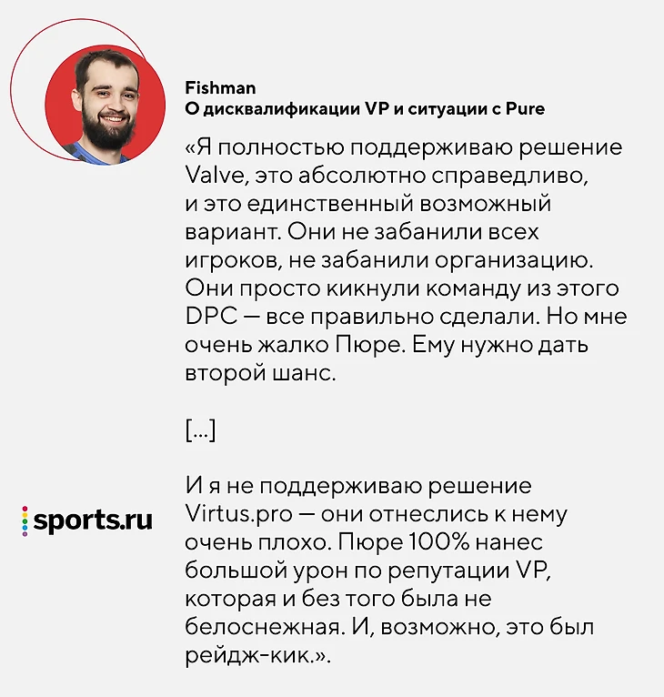 Я полностью поддерживаю решение Valve, это абсолютно справедливо и это единственный возможный вариант. Они не забанили всех игроков, они не забанили организацию. Они просто кикнули команду из этого DPC – все правильно сделали. Но мне очень жалко Пюре. Ему нужно дать второй шанс.
