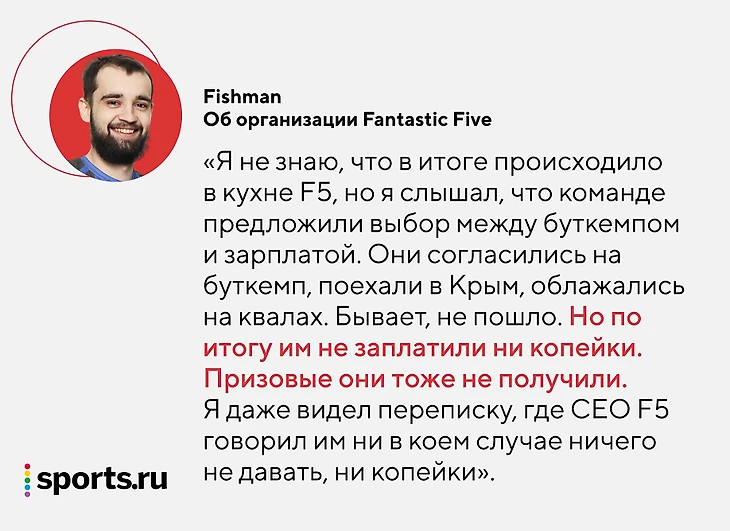 Я не знаю, что в итоге происходило в кухне F5, но я слышал, что их команде предложили выбрать либо буткемп, либо зарплату. Они согласились на буткемп, поехали в Крым и облажались на квалах. Бывает, не пошло. Но по итогу им не заплатили ни копейки. Призовые, которые они выиграли, они тоже не получили. Я даже видел переписку, где CEO F5 говорил им ни в коем случае ничего не давать, ни копейки.