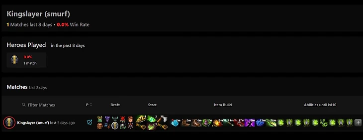 Ilias, он же Kingslayer, после замены на Хакоду и вовсе пропал с радаров. Его нет нигде, он не играет ни в каком стаке, его не увидишь ни у кого на стримах. А ведь Ильяс впечатлял своей игрой, прекрасно нажимал кнопки и был превосходным лейнером – они с Найтфолом могли выиграть совершенно любую линию. Я смотрел десятки его реплеев, еще когда он был игроком Нави, и очень многому у него научился. Но сейчас Ильяс даже матчмейкинг не играет. Такую картину выдает протрекер по запросу: «Kingslayer (smurf)» и это невыносимо больно.