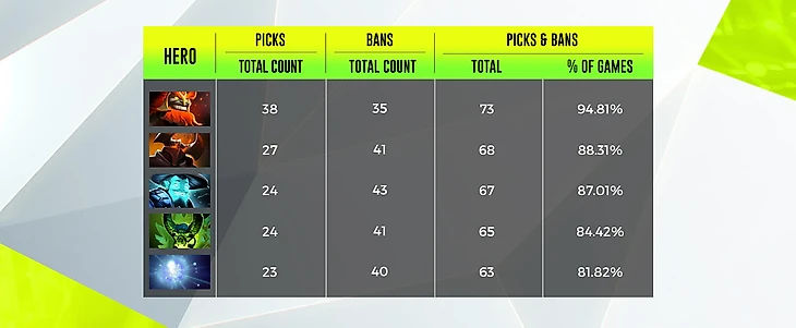 Это был дебют патча 7.31 на мировой арене, и по большей части он удался. Всего за первые четыре дня мейджора было сыграно 77 игр, включая лучшие из 1 на тай-брейках. В этих 77 играх было выбрано 97 уникальных героев. Мета, которая не слишком отличается от той, которую видели во время TI10, довольно разнообразна и позволяет использовать множество различных стратегий. Поскольку мы приближаемся к плей-офф ESL One Stockholm Major, давайте посмотрим, какие герои до сих пор вызывали волну на турнире.
