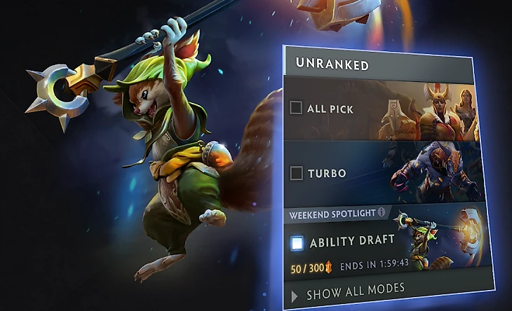 Первым режимом выходного дня станет Ability Draft, и он появится в особом поиске с 8 по 13 июня. Если вы еще ни разу не пробовали этот режим или давно в него не заходили, то сейчас самое время. Создайте жуткие комбинации способностей в простом интерфейсе режима.