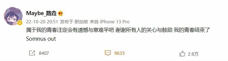 Текущий TI, вероятно, был последним для Мэйби: сразу после поражения от Entity он написал в Weibo, что завершает карьеру игрока. «Наверное, молодость невозможна без сожалений и обид. Спасибо всем за заботу и поддержку. Моя молодость завершена. Somnus уходит».