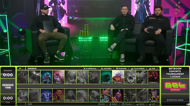 Наконец-то пришло время для Dota 2 в рамках третьего тура киберспортивной медийной лиги BET! Первая bo2-встреча дня стартовала по расписанию, а составы были такими: CKS представляла пятерка iLTW, MIERO, VITAHAA, CIMUS, LEO, в то время как за SNKRHD выступали ALBERKAA, ANTARES, DILBLINN, YULIA PINKO, YOS. Команды были максимально сбалансированы — по два профессионала и по три медийных персоны в каждой. Основная борьба должна была развернуться между дуэтами iLTW + MIERO против ALBERKAA и ANTARES, и именно эта четверка стала типать друг друга в начале первой катки.