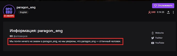 Интересно выглядел и канал англоязычной трансляции Paragon: у него просто не было описания. «Мы почти ничего не знаем о...» – это дефолтная паста Твича, которая пишется при незаполненной информации об аккаунте. Информация не заполнена и до сих пор.