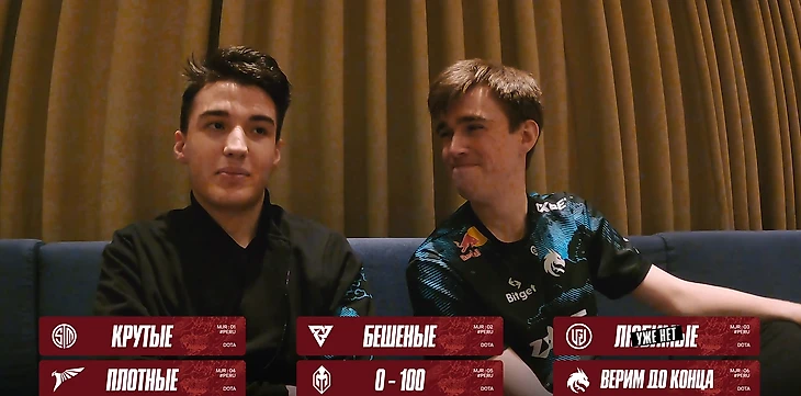 А пока ребята фотографировались и раздавали интервью в рамках медиа-дня, мы решили опробовать на них нашу новую рубрику. Инфлюенсеры из dota-комьюнити задали вопросы, которые волнуют их больше всего нашим парням. В первом влоге Даша Eiritel спросила команду с какими фразами из геройского колеса чата они себя ассоциируют. Так мы узнали, что Collapse идеально пародирует Пуджа, Lari согласен с Ораклом, а Mira уважает Tiny.