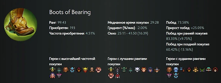 Винрейт Boots of Bearing в профессиональных играх великолепен – больше 73%.