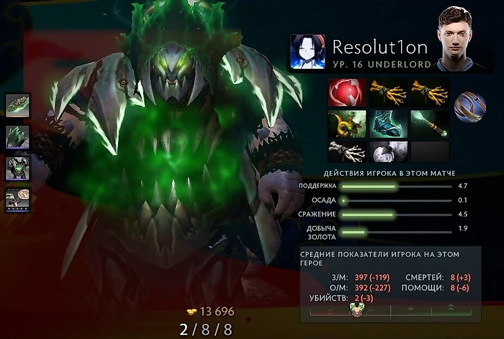 Скромные по сравнению с тиммейтами 4-2-13, и Resolut1on выигрывает соревновательную игру на Legion Commander первый раз с 2020 года.