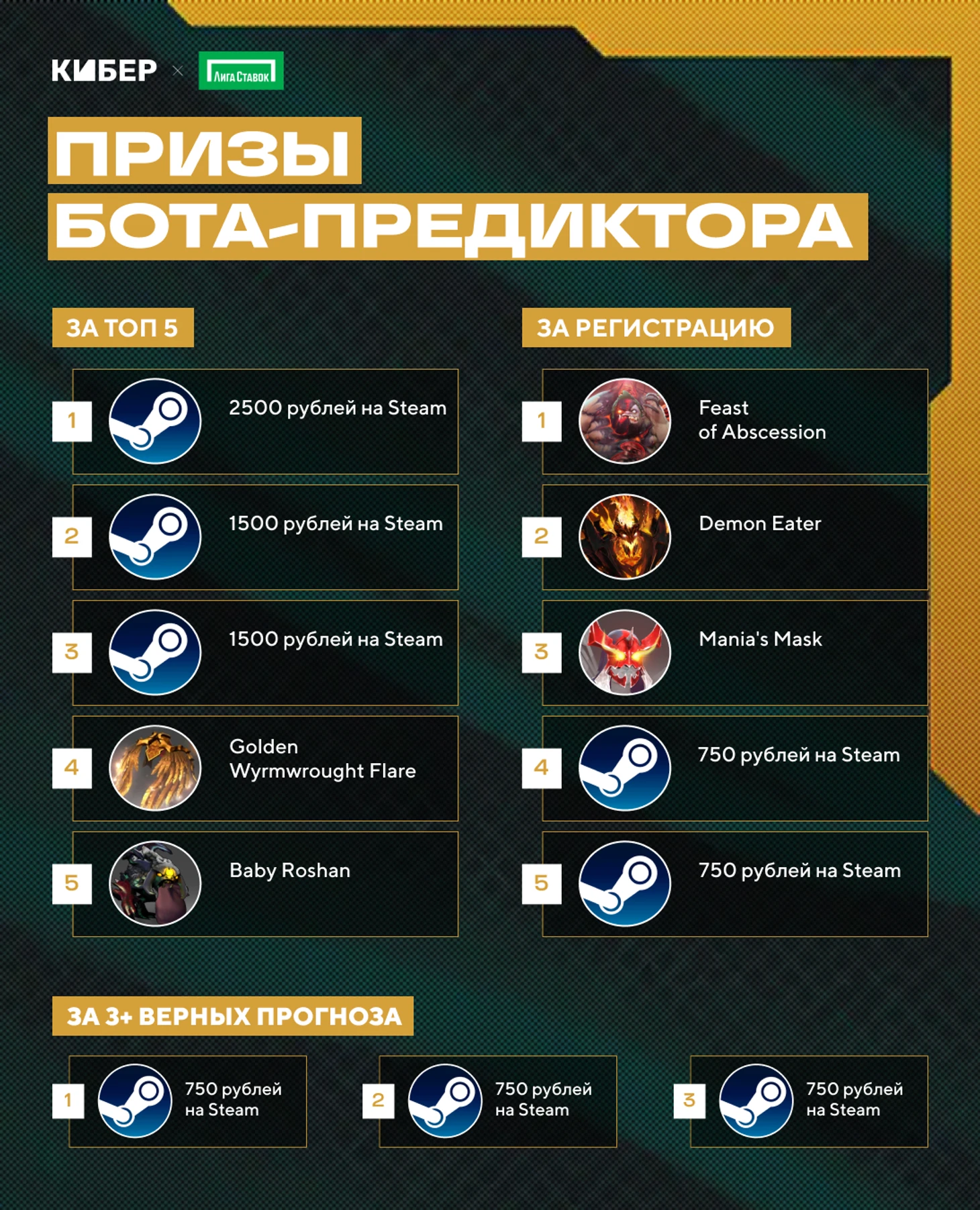 Кратко для новичков: в боте появляются матчи, вы делаете прогнозы на их исход и ставите монеты. В зависимости от коэффициента, за правильные прогнозы вы получаете больше монет, а за ошибочные – теряете. Лучшие прогнозисты получат крутые призы от Кибера и Лиги Ставок: модные скины и приятные фрибеты.