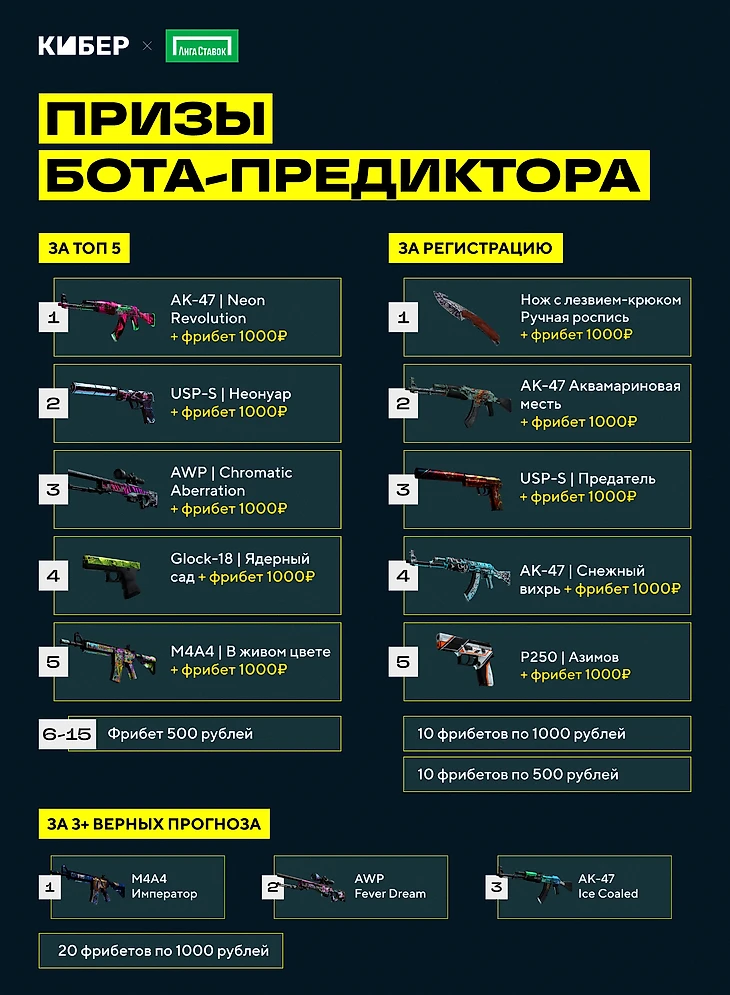 Как это работает: каждый день турнира в боте можно будет сделать прогнозы на матчи, поставив на них монеты. Чем выше коэффициент – тем больше монет вы получите за верный прогноз. Если предикт оказался ошибочным, монеты сгорают. Лучшие прогнозисты получат крутые призы от Кибера и Лиги Ставок: модные скины и приятные фрибеты.