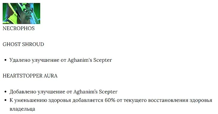 Любой герой умрет за считанные секунды, благодаря сумасшедшему ХП регену у Некра. Ибо Аганим отнимает у врагов 60% от текущего восстановления здоровья владельца. Конечно, в реальной игре, навряд ли набьешь даже 20 стаков от ульты, но поверьте- это очень сильное усиление и сейчас играть Некром стало намного приятнее.