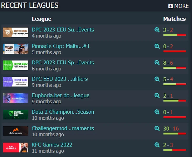 Аккаунт совсем недавно закрыли на Дотабаффе, но мы успели его изучить до того, как это случилось. На ДБ есть так называемый «Киберспортивный профиль» – достаточно сыграть хотя бы один официальный матч, чтобы он появился. Так вот с этого аккаунта игрались открытые квалы во второй дивизион DPC Восточной Европы, Pinnacle Cup и много разных тир-3-4 турниров.